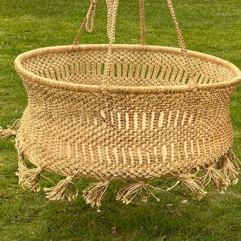 Babynohr vugge til baby i naturfarvet stof. Vuggen hænger i et stativ og er udført i lyst tekstil med madras i bunden. Ophænget består af fjeder, karabinhage og metalbeslag, som fordeler vægten og gør det muligt at vippe vuggen roligt op og ned. Velegnet som sove- og hvileplads til spædbørn i hjemmet. Stativ og vugge kan placeres frit i rummet, f.eks. ved vindue eller seng, afhængigt af pladsforhold og behov.