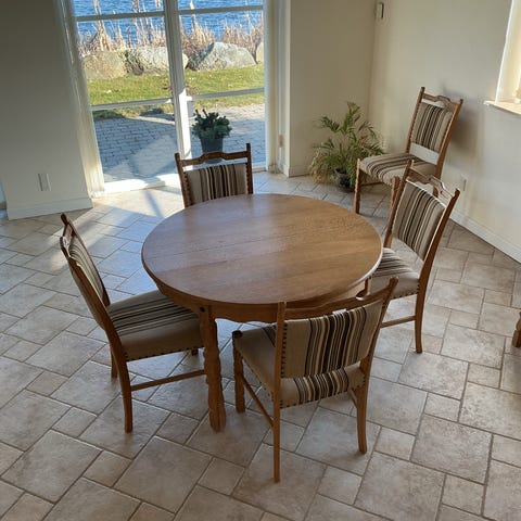 Lækkert spisebordssæt i hvidolieret eg med 6 stole og 1 tillægsplade. Meget velholdt. Skal afhentes i Lyngby. Man skal selv kunne bære det ned da jeg sælger for mine forældre og de kan ikke hjælpe.