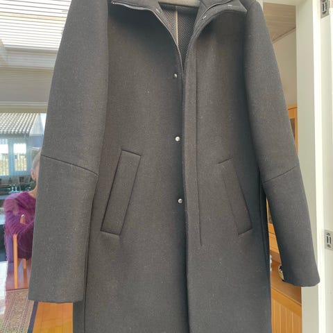 Matinique frakke til herre i størrelse L. Frakken er i grå uld med klassisk snit og knaplukning foran. Modellen har to forlommer og en brystlomme samt slids bagpå for bedre bevægelse. Indvendigt er frakken foret med glat foer i kontrastfarver. Velegnet som yderjakke i køligere vejr og til både hverdag og mere formelle anledninger.