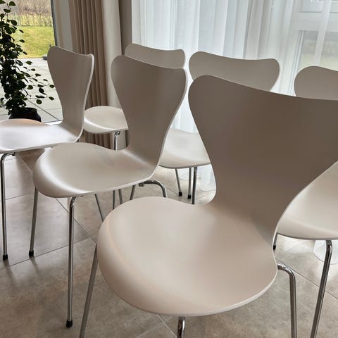 4 stk. 7'er stole. Fritz Hansen stole designet af Arne Jacobsen. Klassisk skalstol i hvidt sæde/ryg med metalben. Velegnet som spisebordsstol eller ekstra stol i køkken eller stue. Enkel og funktionel stol i tidløst design.