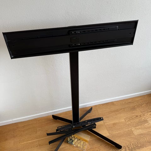 Jysk tv‑stativ i stål i beige farve. Stativet er fritstående og passer til tv‑størrelser ca. 32‑65" (ifølge produktoplysninger). Konstruktionen er i stål med front, top, ben, stel og hylde i samme materiale. Tv‑stativet har 1 hylde under tv‑beslaget til opbevaring af fx medieudstyr. Udstyret med 4 hjul og 4 justerbare fødder, så stativet kan flyttes og tilpasses underlaget efter behov.