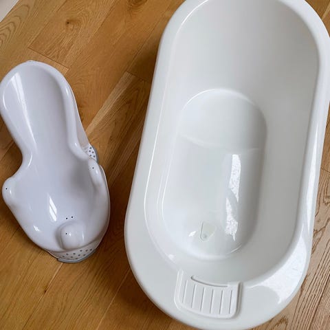 Baby badekar i hvid plast med afrundede kanter. Indvendigt er der grønne skridsikre bølgemønstre i bunden. Badekarret er egnet til badning af spædbørn og små børn og kan placeres på gulv eller i større badekar. Materialet er let at rengøre og tåler almindelig brug i hjemmet.
