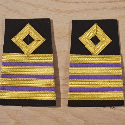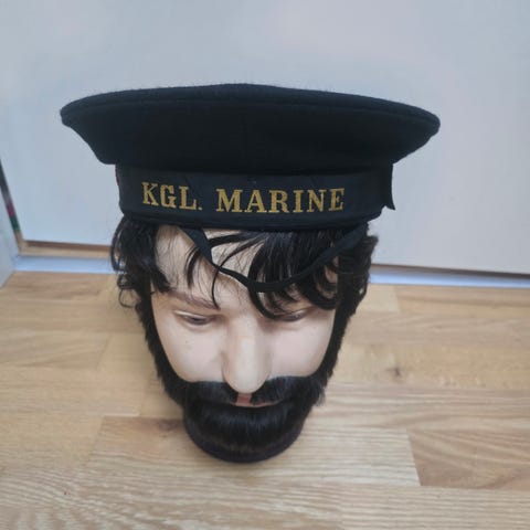 Sømandsbluse med klassisk knude-detalje foran. Blusen har mørk yderside med kontrastfarvet indvendig kravekant. Egnet som del af sømands- eller uniformsinspireret beklædning. Materiale og størrelse er ikke oplyst.