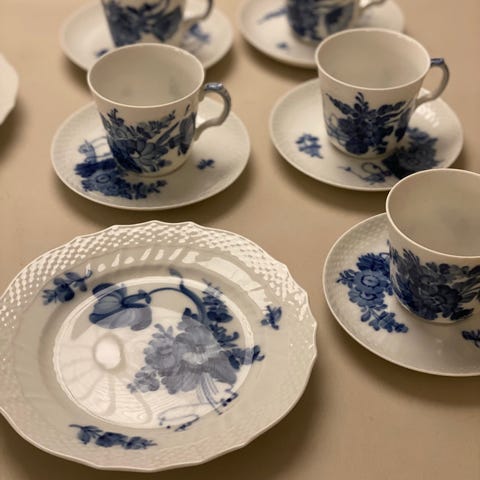 BYD GERNE😊 en masse Royal Copenhagen Blue Flower porcelænsstel med kopper, underkopper og tallerkener. Stellet er i hvidt porcelæn med blå blomstermotiv. Sættet omfatter tekopper med hank og tilhørende underkopper samt små tallerkener med samme dekoration. Velegnet som kaffestel eller til servering af te og kage. Mærkning fra Royal Copenhagen ses under kopperne.