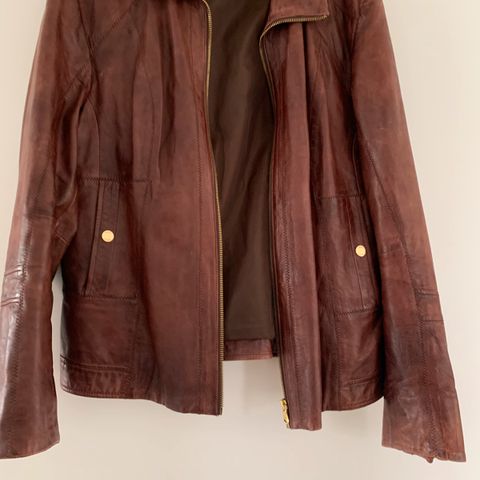 Læderjakke med fór og pelset krave fra Saki Puls. Måske rulam? Lukkes med knapper.
