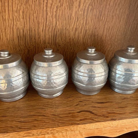 Har patina og brugsspor som giver et rustikt udtryk. Ukendt materiale, muligvis forsølvet metal.