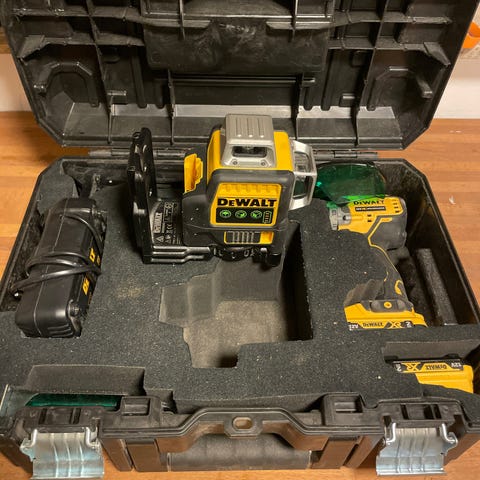 DeWalt 18V krydslinjelaser med grøn laserlinje. Enheden drives af 18V batteri (batteri ses ikke på billederne). Sættet omfatter selve krydslinjelaseren, holder/beslag, transportkuffert samt tilbehør som vist på billederne. Egnet til opmærkning og nivellering ved bygge- og monteringsopgaver, hvor synlige grønne linjer ønskes på vægge, gulve og lofter.