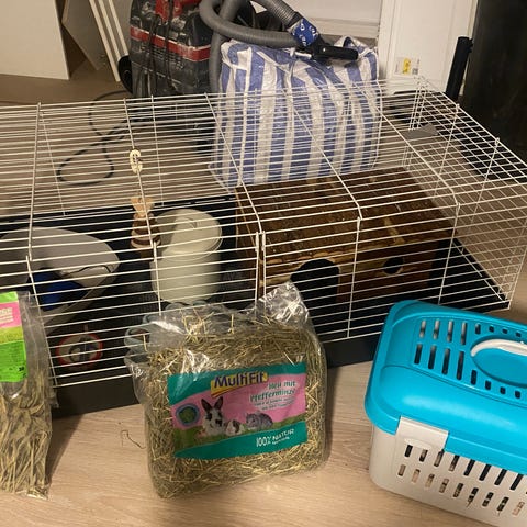 Flot kaninbur i 2 etager. Inklusiv foderkasse tilhørende 12,5 kg. Foder. Flere poser hø og halm. Kanin snack. Inkludere også hø holder, negleklipper, sele og børste. Perfekt som komplet starter kit. Buret kan åbnes i både top og bund og kaninen kan gå op og ned mellem de 2 etager. Taget kan tages af og begge etager har bakker der kan trækkes helt ud til rengøring.