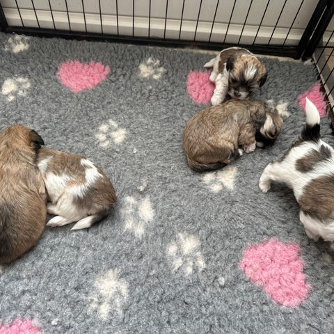 Vi har et dejligt kuld plettede Lhasadoodlehvalpe, født den 19. Januar, som er klar til at flytte hjemmefra mandag den 16. Marts. Kuldet består af to hanner og tre tæver. Mor er Lhasa apso og far er dværgpuddel.
