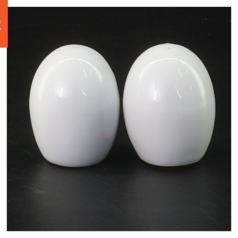 Objektet er en hvid salt og peber shaker af keramik. Den er 6 cm høj og har flere huller på toppen til krydderidispensering. Enkelt design og glat overflade.
