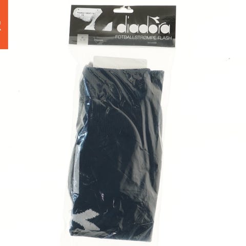 Et par Diadora fodboldstrømper. Strømperne er sorte med hvide detaljer og er pakket i en gennemsigtig plastpose med en sort etiket. Lavet af 70% polyester, 20% bomuld, 10% elastik. Størrelse 35-39.