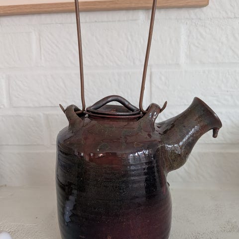 En flerfarvet porcelæn te-kande med delikate blomsterdekorationer. Kanden har et traditionelt design med en buet tud og et buet håndtag. Designet omfatter bølgende kanter og en matchende lågtop. Bundbilledet viser mærket eller nummeret '89/75'.
