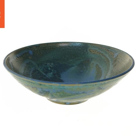 hånddrejet skål, lavet af keramik og har en diameter på 25 cm. Den har en unik flerfarvet glasur med nuancer af grøn og blå. Skålen har en lav profil og rund form. Bunden af skålen viser mærket 'Keramikværkstedet Saxo' og navnet 'Anna'.