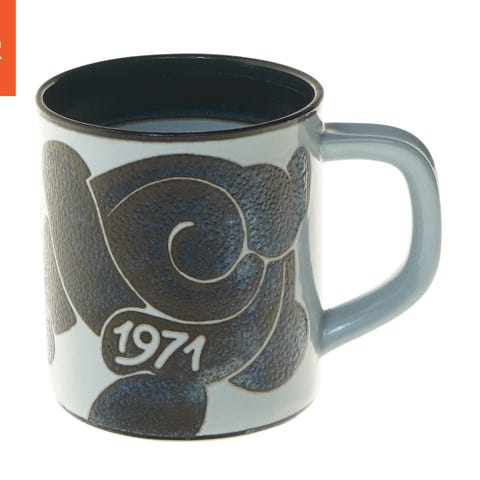 Koppen er lavet af keramik med et kunstnerisk design og har årstallet 1975 trykt på ydersiden. Den har et elegant håndtag og dekorative detaljer i blå og grå nuancer. Undersiden viser flere mærker, inklusive Royal Copenhagen's logo.
