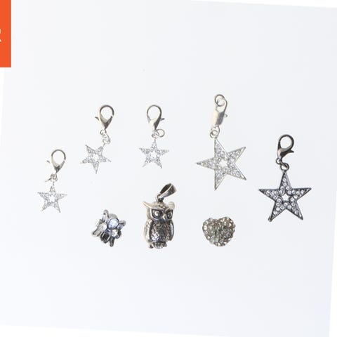 hjerteformet vedhæng. og er lavet med en glasklare, facetterede sten på en metalring. Stenene fremstår med en lys brun nuancer, hvilket giver dem et klassisk og elegant look. Størrelsen på hver vedhæng er 30 mm.