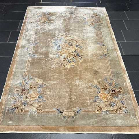 Dette tæppe imponerer med sin fine kinesiske billedkomposition med arkitektoniske motiver, symbolik og harmoniske farver.