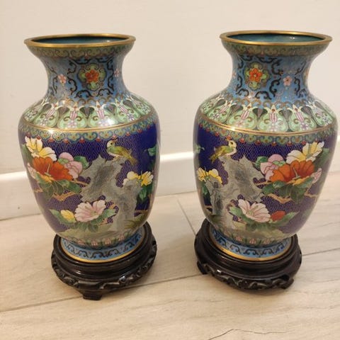 Par Canton-vaser i kobber og emalje, XX. århundrede, Kina; to stykker, 58 cm højde, 27 cm bredde, 12 cm dybde, i fremragende stand. Klik på den blå "gå til varen" knap, for at købe eller byde på denne vare. Den samlede pris vil blive vist inden du afgiver dit bud.