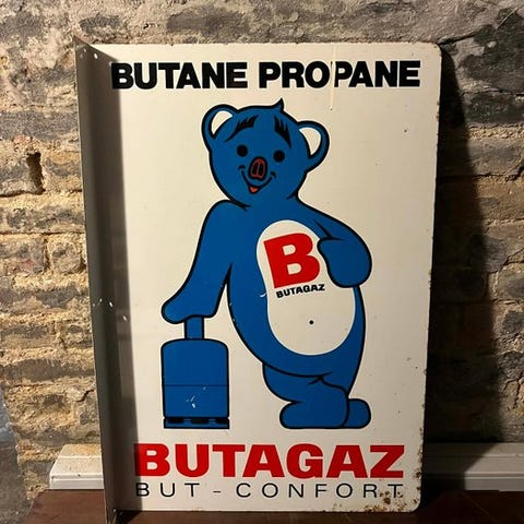 Camping Gaz International, to-laget metalstykke malet på begge sider fra Frankrig, dateret 1960–1970, hvid, blå og rød, 40 × 35 cm, jern, originalt/officielt, i forholdsvis god stand med intens brug og mulige mindre mangler; ét stykke. Klik på den blå "gå til varen" knap, for at købe eller byde på denne vare. Den samlede pris vil blive vist inden du afgiver dit bud.