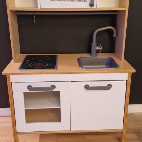 legetøjsmikroovn i hvid og rød plast. Mikroovnen har gennemsigtig låge med rødt kantstykke, drejetallerken indeni samt betjeningspanel med knapper på siden. Egnet til rolleleg i legekøkken. Drives af batterier (ikke synlige på billederne, batteritype fremgår af bagsiden). Velegnet til børn, der leger køkken og madlavning.