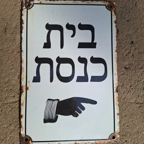 Judaica – Original emalje- og stålgadeplakette, hebraisk indskrift "synagoge"...