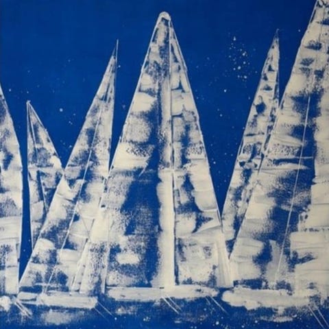 Smukt maleri af Jan Rusten, 57,5 x 47,5 cm, fra 2012, til salg, med titel “Sea and Foggy Sea in Vesterålen”. Norge.