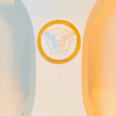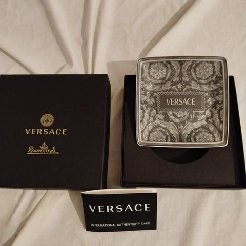 Tingen har en rig rød bund med indviklet gyldent ornamentik, indrammet af sorte kanter med detaljeret guldføring. I midten er der et klassisk medaljongmotiv, der skildrer en mytologisk vognscene, et designudtryk tæt forbundet med Versaces neoklassiske æstetik.