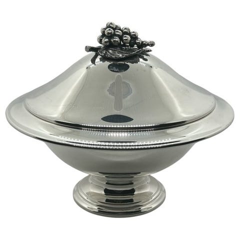 Terrinen er udstyret med sculpturale vingeformede sidehåndtag afsluttet i matguld, hvilket giver værket både dramatisk tilstedeværelse og et godt greb ved servering. Det kuppelformede låg, dekoreret med en sort- og guld barok kant, prydes af en stiliseret vingeformet knop, der gentager designet i håndtagene og