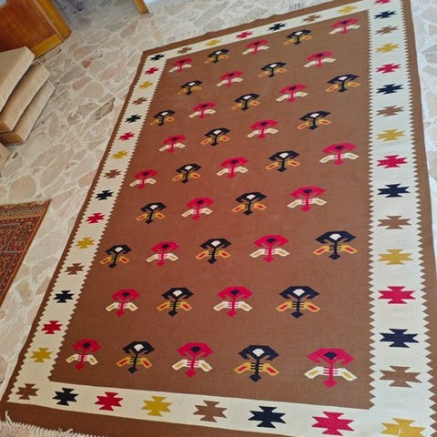 Håndlavet moldavisk kilim-tæppe fra Moldova, uld på uld, flerfarvet, 172 × 112 cm, ca. 1970, professionelt renset, i god stand med spor af ældning og brug, vægt 2 kg. Klik på den blå "gå til varen" knap, for at købe eller byde på denne vare. Den samlede pris vil blive vist inden du afgiver dit bud.