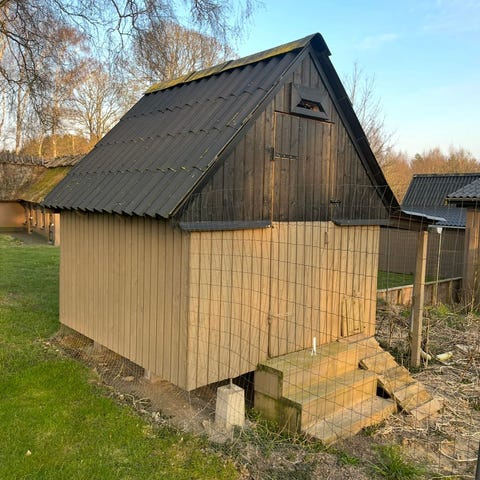 Det malede stykke er overdækket og den nye, umalede hønsegård er uden tag.