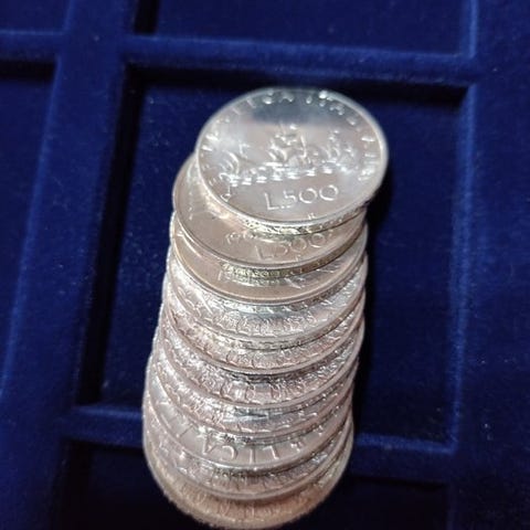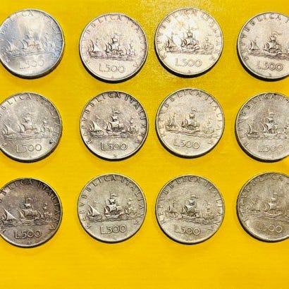 Lotte på 24 mønter 500 lire fra den italienske republik med karavelle. Hver vejer 11 gram, samlet vægt 264 gram (313 gram vejet med blister)