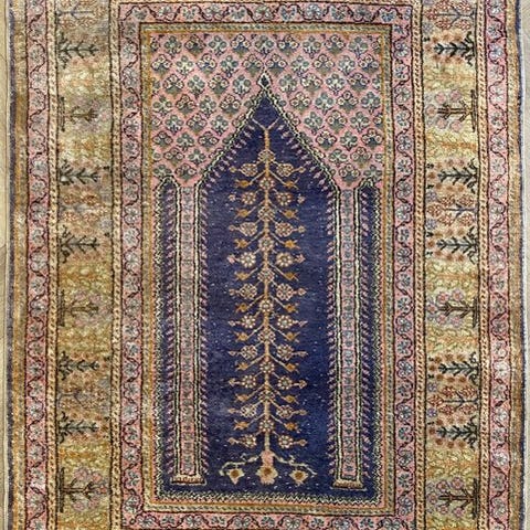 Det indre felt er udformet som en stiliseret bønneniche og viser et symmetrisk opbygget træ- og rankemotiv. Blomsterlige elementer samt dekorative dyrefigurer giver tæppet en levende, traditionel udstråling. Den rigt dekorerede bordure med geometrisk-florale ornamenter indrammer det lyse baggrundsfelt harmonisk.