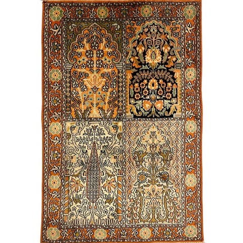 Håndlavet tæppe, unikt stykke, silke over bomuld, oprindelse Pakistan, midten af det 20. århundrede, mål 169 x 108 cm, generelt i god stand og ikke professionelt rengjort. Klik på den blå "gå til varen" knap, for at købe eller byde på denne vare. Den samlede pris vil blive vist inden du afgiver dit bud.