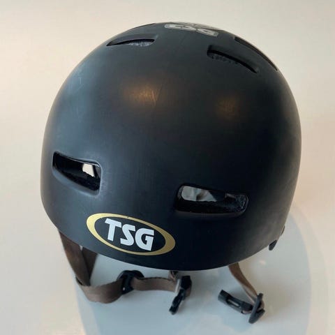 TSG hjelm i størrelse L. Hjelmen er sort og har flere ventilationshuller i toppen. Indersiden er polstret for øget komfort, og der er CE-mærkning på etiketten. Velegnet som beskyttelseshjelm til fx cykling, skate eller lignende aktiviteter, hvor hovedbeskyttelse er påkrævet.