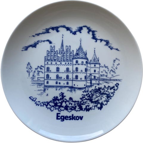 Flot platte fra Bygdø i blå stregtegning med motiver fra Jesperhus Blomsterpart & Feriecenter.