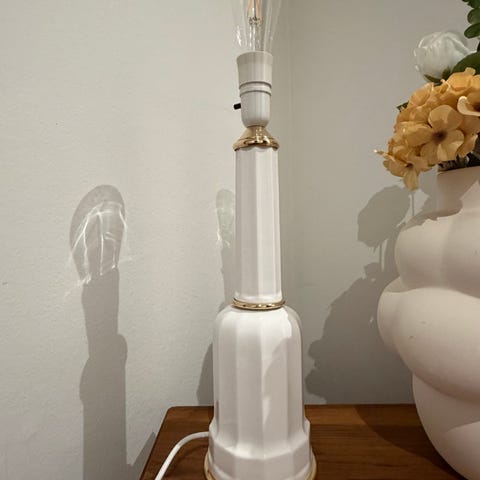 Fin, stor gammel Søholm / Heiberg lampe, hvidt porcelæn og messing, i pæn stand. Den måler 48 cm i højden, incl fatningen men plus skærmholder. Den er 14 cm i diameter nederst. Pæn, ren og fra ikke-ryger hjem, virker helt som den skal, med afbryder på den fine gamle porcelænsfatning og med skærmholder.