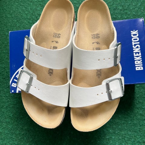 Meget pæne i lys gullig beige, knapt brugsspor. Til smal fod vistnok, se symbolet for udfyldt fod vs omrids (tjek på Birckenstok hjemmeside). Kan sendes.