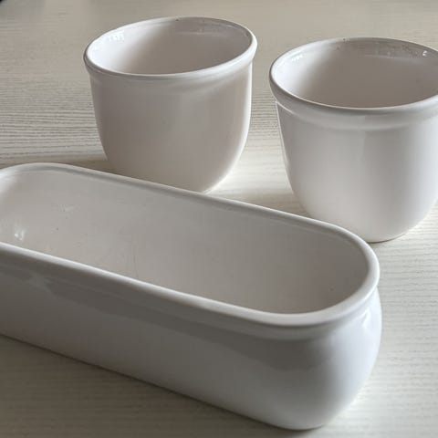 2 stk. rigtig flotte hvide perlemorsagtige glas urtepotteskjulere, er firkantede H: 12 cm B: 10x10 cm