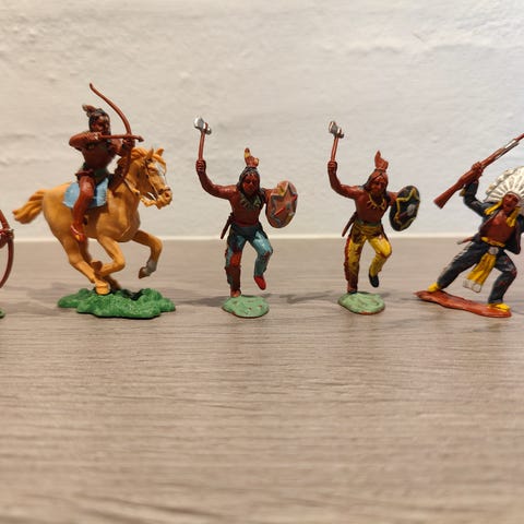5 figurer fra Heralds gyldne periode. Produceret 1954-1967. At malingen er afskallet, er helt normalt, da Heralds i starten havde problemer med at få malingen til at hæfte på plastikken. Man iblandede derfor kridt for bedre vedhæftning, hvilket til gengæld gjorde dem skøre.