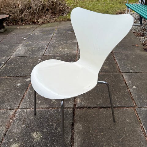 Fritz Hansen Arne Jacobsen stol i hvidt sæde med forkromet stålstel. Klassisk skalstol velegnet til spisebord, kontor eller mødelokale. Designet af Arne Jacobsen for Fritz Hansen. De 3 hvide 7´er stole sælges enten enkeltvis eller samlet.