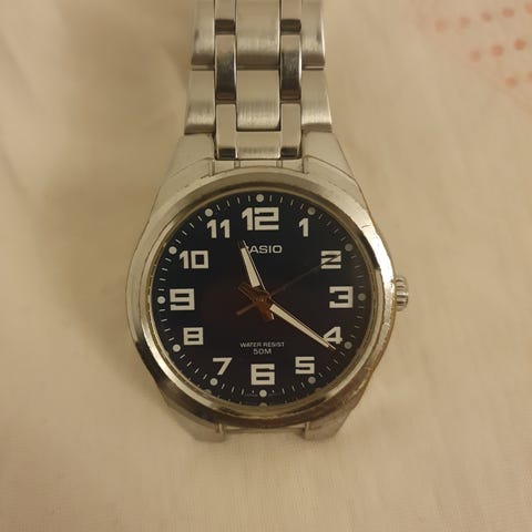 Casio herreur analog ur til mænd med sort skive og tydelige time- og minutmarkeringer. Uret har drejelig lynette, datovisning ved kl. 3 og tre visere med lumen (time, minut og sekund). Kassen er i metal med skruet bagkasse, og uret leveres med sort rem i kunststof/gummi med spænde. Leveres i Casio-æske som vist på billederne. Som nyt. Kvittering haves.