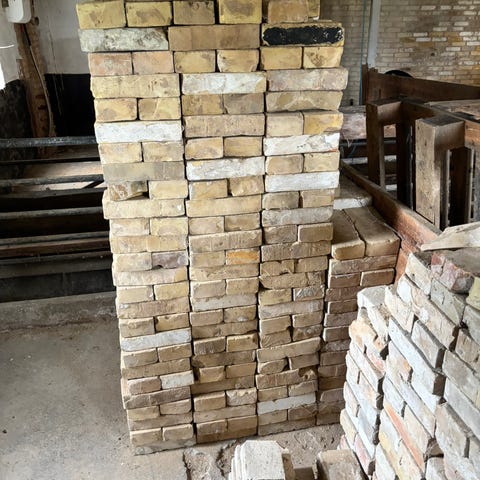 Mursten i blandede farver, primært gule og røde. Murstenene ligger stablet på en palle og fremstår som et blandet parti med både hele og enkelte afskårne sten. Egner sig til murerarbejde, reparationer, mindre byggeprojekter eller kreative udendørsprojekter som kantsten, bede eller lignende.