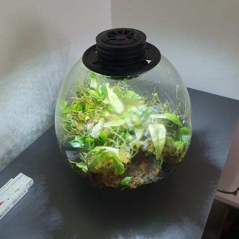 Terrarium / Akvarium på sort sokkel med bundlag