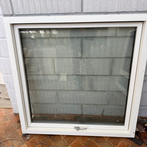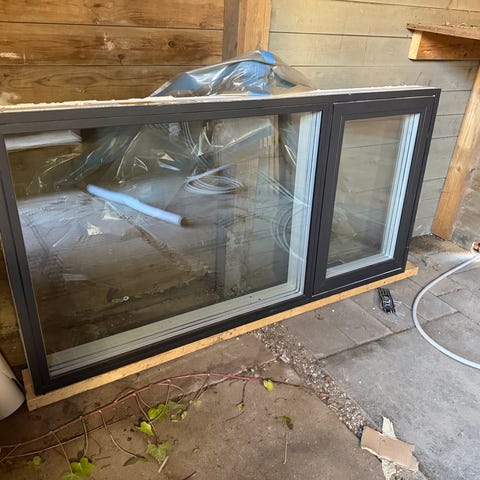 Træ/alu i pæn stand, hvide indvendig, mørkegrønne udvendig.