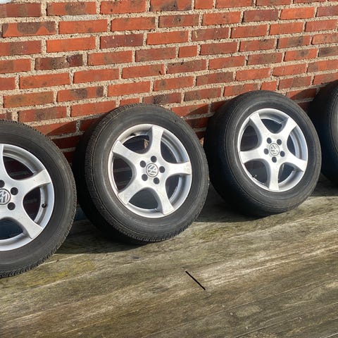 Dæk og fælge som har siddet på en VW Golf 4. To af dækkene er meget slidte.