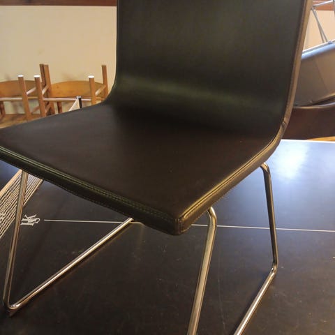 IKEA stol med sort sæde og ryg samt stel i kromfarvet metal. Sædet har en glat overflade og let buet ryg for støtte. Benene er udført som slædestel, hvilket giver et enkelt og let udtryk. Velegnet som spisebordsstol, kontorstol til hjemmekontor eller ekstra siddeplads i stue eller værelse.