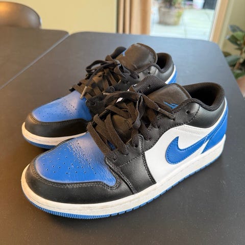 Nike Air Jordan Low basketballsko i størrelse 40. Skoene er lave sneakers designet til basketball og hverdagsbrug. Farvekombination i blå og hvid med snørelukning og gummisål. Velegnet til basketball eller som casual hverdagssko.