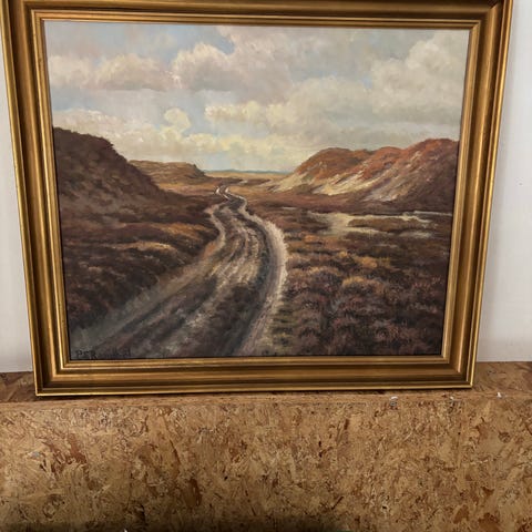 Olie maleri landskab med heste ca 60x80 + guldramme