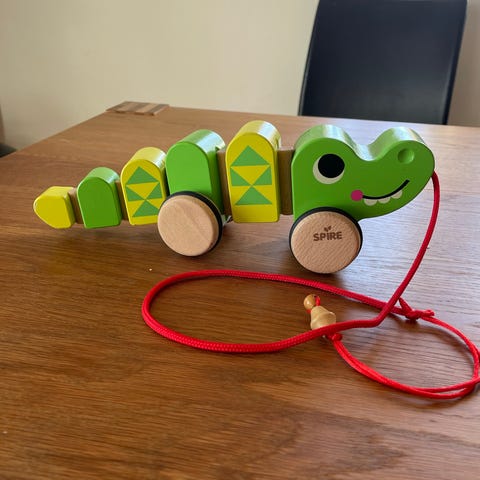 BRIO træand skubbelegetøj i naturtræ med røde hjul. Legetøjet består af en andeformet krop i træ med lang skubbestang, så barnet kan skubbe legetøjet foran sig. Hjulene er runde og røde, og anden har sorte detaljer på hale og næb. Egnet som klassisk trælegetøj til mindre børn til brug indendørs på glatte gulve.