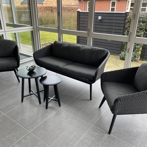 Vigsø loungesæt med 2 stole, 1 sofa og et loungebord. Super flot, let og elegant til havestunder. Det er fremstillet i aluminium med polyrattan flet. Det er vedligeholdelsesfrit og vejrbestandigt. Kan bestilles i en antracitgrå eller beige.