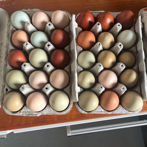 Olivenlæggere og forskellige æg i forskelligenuancer(Maran x Cream Legbar)